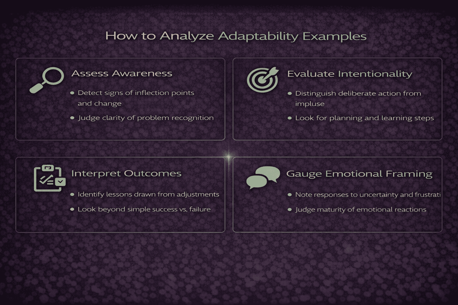 The second element is intentionality. Recruiters should examine whether the candidate acted deliberately or reacted impulsively. High-quality adaptability examples include descriptions of planning, consultation, experimentation, and reflection, rather than rushed decisions driven by frustration.