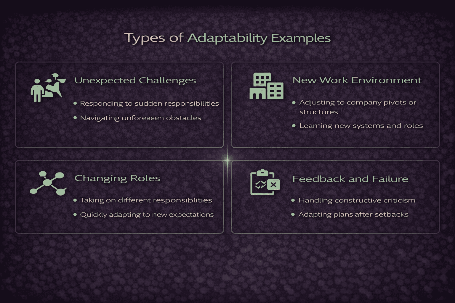 Adaptability examples can be grouped into several distinct types, each highlighting a different dimension of how individuals respond to change. One category centers on learning agility. These examples describe situations in which candidates were required to acquire new knowledge or skills rapidly, such as mastering an unfamiliar software platform, adopting a new methodology, or transitioning into a role with expanded responsibilities. The defining characteristic of these stories is not speed alone, but the strategies used to learn—seeking mentorship, experimenting with approaches, or reframing mistakes as learning opportunities.