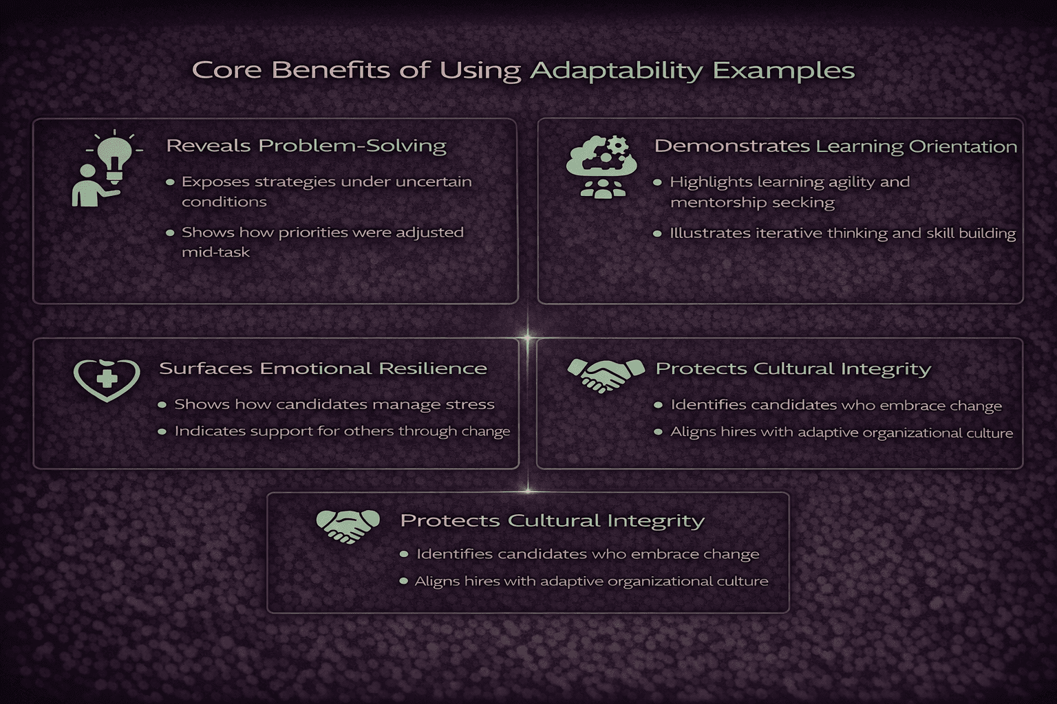Adaptability examples also surface emotional resilience. They show whether candidates internalized stress constructively or allowed it to derail performance. Individuals who articulate how they regulated emotions and supported others during change tend to strengthen team stability rather than destabilize it.
