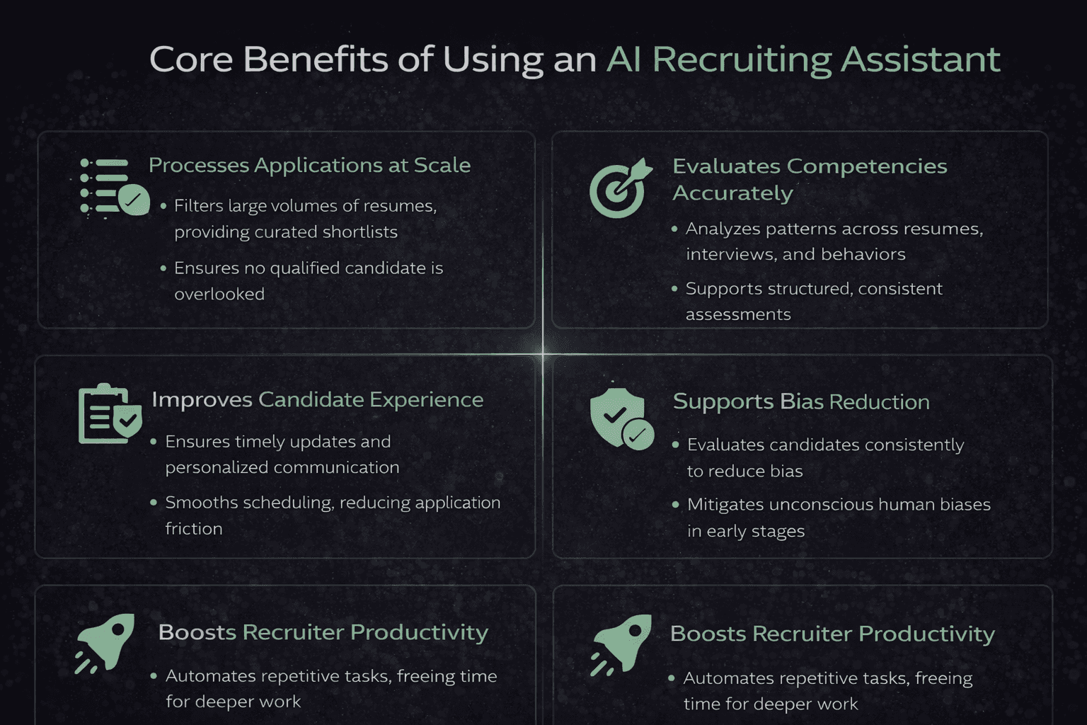 AI recruiting assistants matter because they address some of the most persistent challenges in talent acquisition. Hiring teams often struggle with overwhelming candidate volume, inconsistent evaluation standards, communication bottlenecks, and human bias. AI systems offer structure, consistency, and analytical depth that support stronger hiring outcomes.