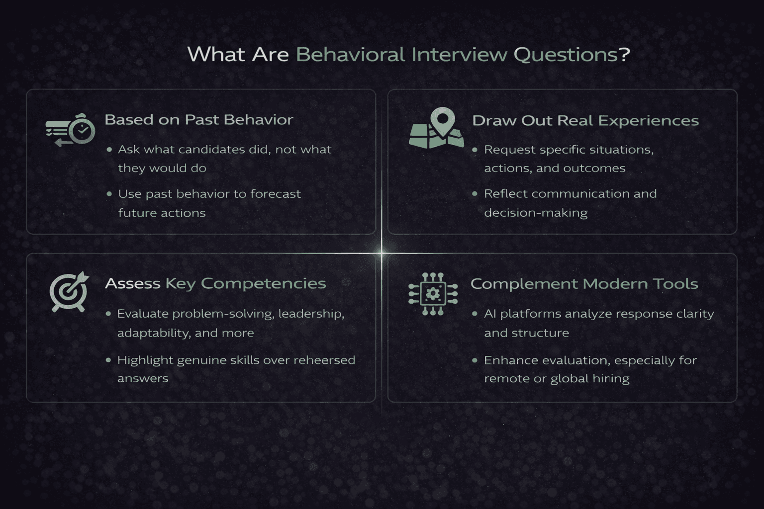 Definition | Past behavior assessment | Predicts future performance | Stronger hiring decisions |