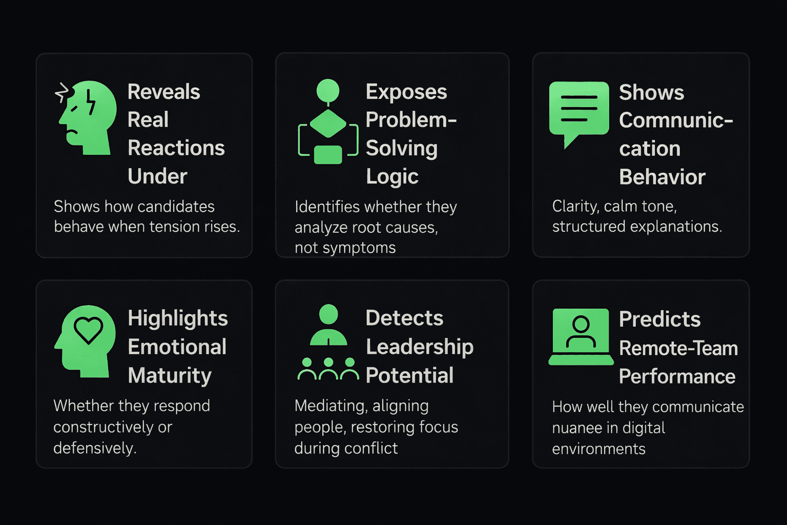 Revealing real behavioral patterns | Shows how candidates respond under interpersonal stress. | Predicts stability and trust within teams. | Improves selection of emotionally mature professionals. |