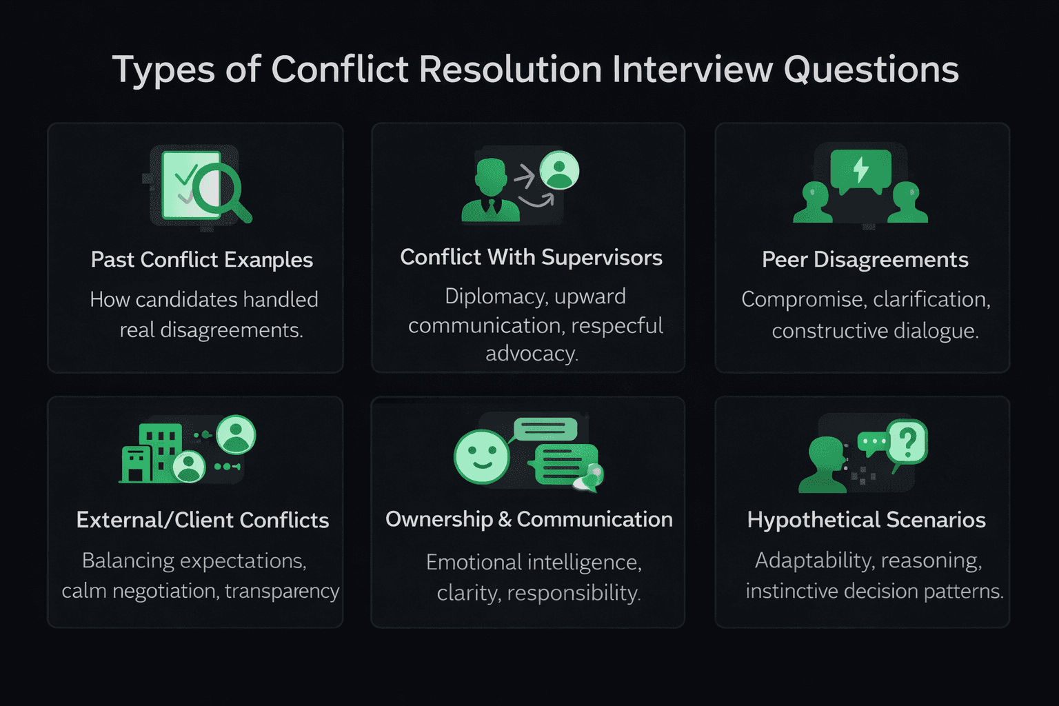 Definition | Explains what conflict questions evaluate. | Reveals behavior under interpersonal pressure. | Sets foundation for candidate comparison. |