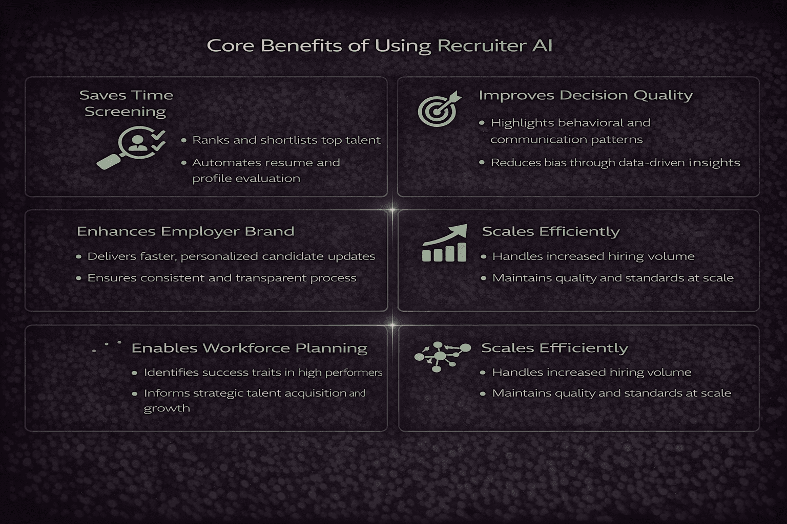 Another core benefit is improved decision quality. Recruiter AI highlights behavioral patterns, communication clarity, and alignment with role requirements, enabling hiring teams to move beyond surface-level impressions. As outlined by SHRM, structured assessments are more reliable predictors of long-term success than unstructured interviews alone.