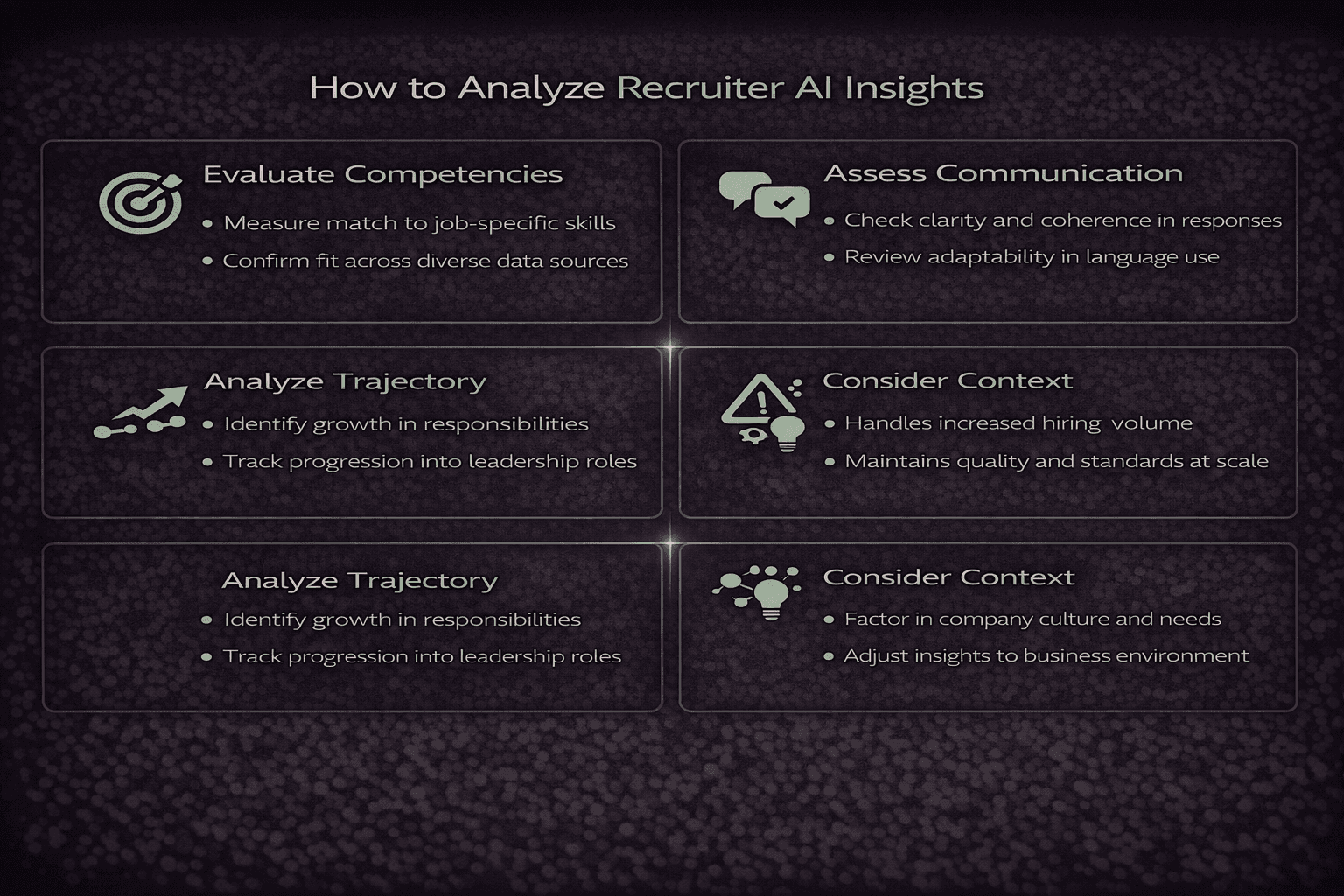 Analyzing recruiter AI insights effectively requires a shift in how hiring teams interpret candidate data. Rather than treating AI output as final verdicts, organizations should view these insights as structured signals that complement human judgment. The most valuable recruiter AI systems do not replace intuition, but challenge it by highlighting patterns that are difficult to observe consistently at scale.