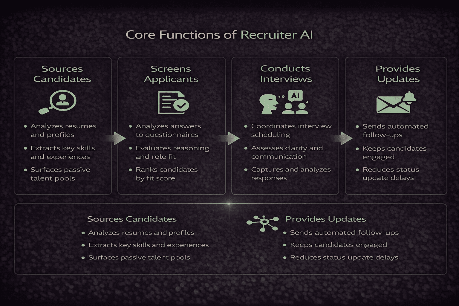 A practical way to understand recruiter AI is to see it as a system that assists with three broad areas: evaluation, communication, and orchestration. On the evaluation side, recruiter AI can parse resumes, compare candidate profiles to job descriptions, and identify relevant skills and experience. It may also analyze candidate responses in screening questionnaires or interviews to detect patterns in reasoning, clarity, and role alignment. On the communication side, recruiter AI can improve candidate experience through automated outreach, timely updates, and intelligent scheduling that reduces delays. On the orchestration side, it connects recruitment steps into a smoother workflow, helping teams coordinate interviews, compile feedback, and maintain consistency across stakeholders.