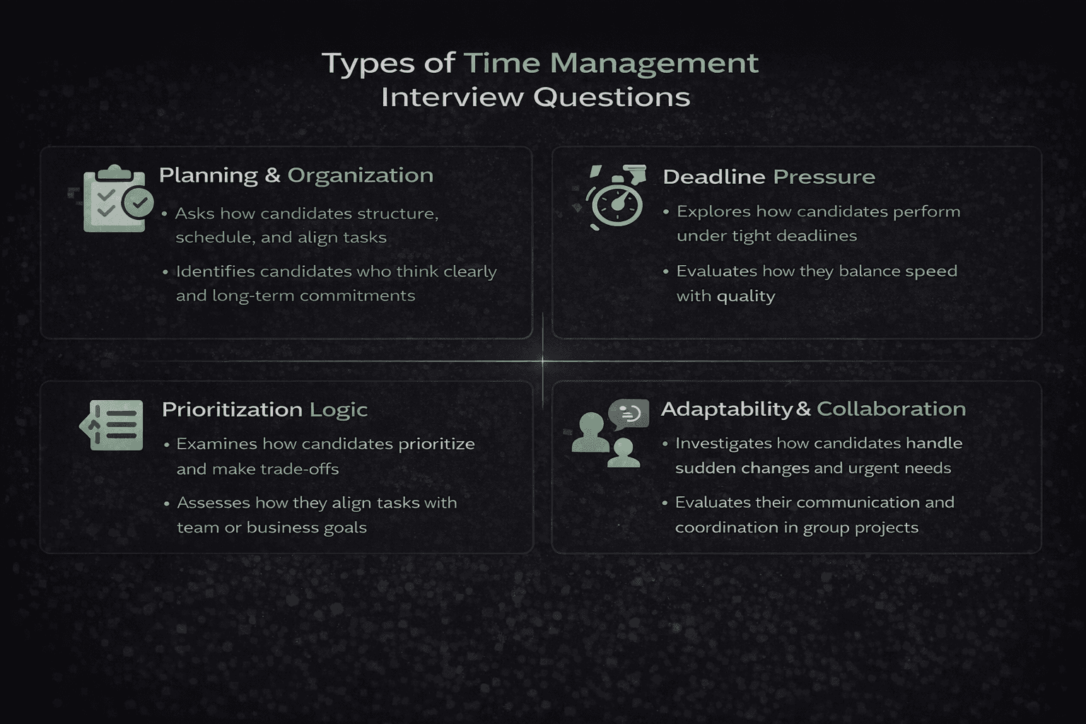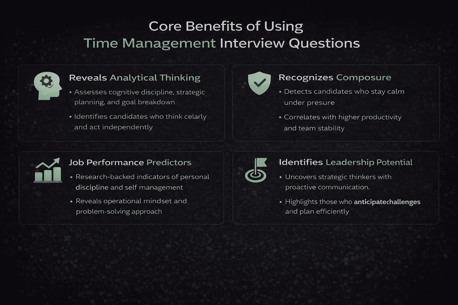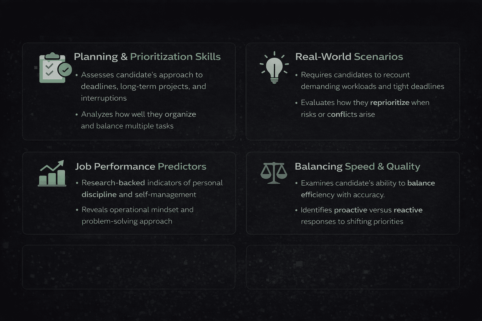 Companies like Indeed note that time management questions are research-backed predictors of job performance because they reveal personal discipline, operational mindset, and self-awareness. They demonstrate how candidates manage themselves rather than how they respond to external instructions.